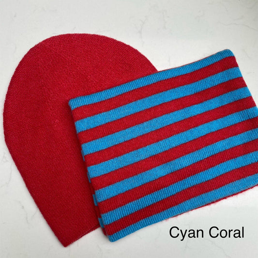 Cashmere Snood & Beanie Gift Set - Cyan & Coral